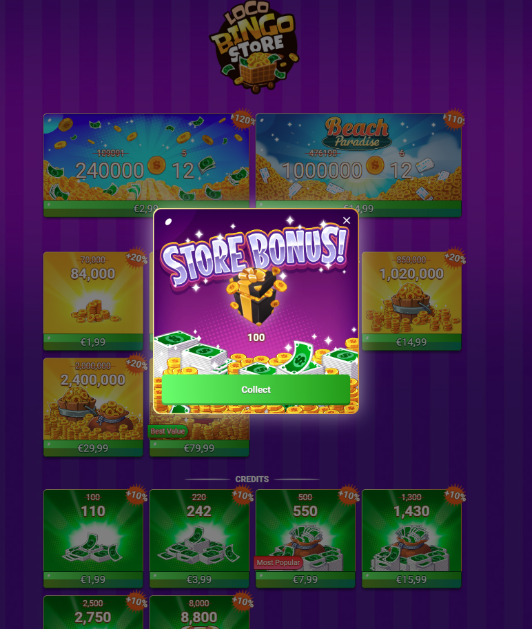 Et voilà! Il ne vous reste plus qu'à vous rendre sur le jeu LOCO BINGO où un coffret cadeau apparaîtra avec les pièces ou les crédits de votre achat.